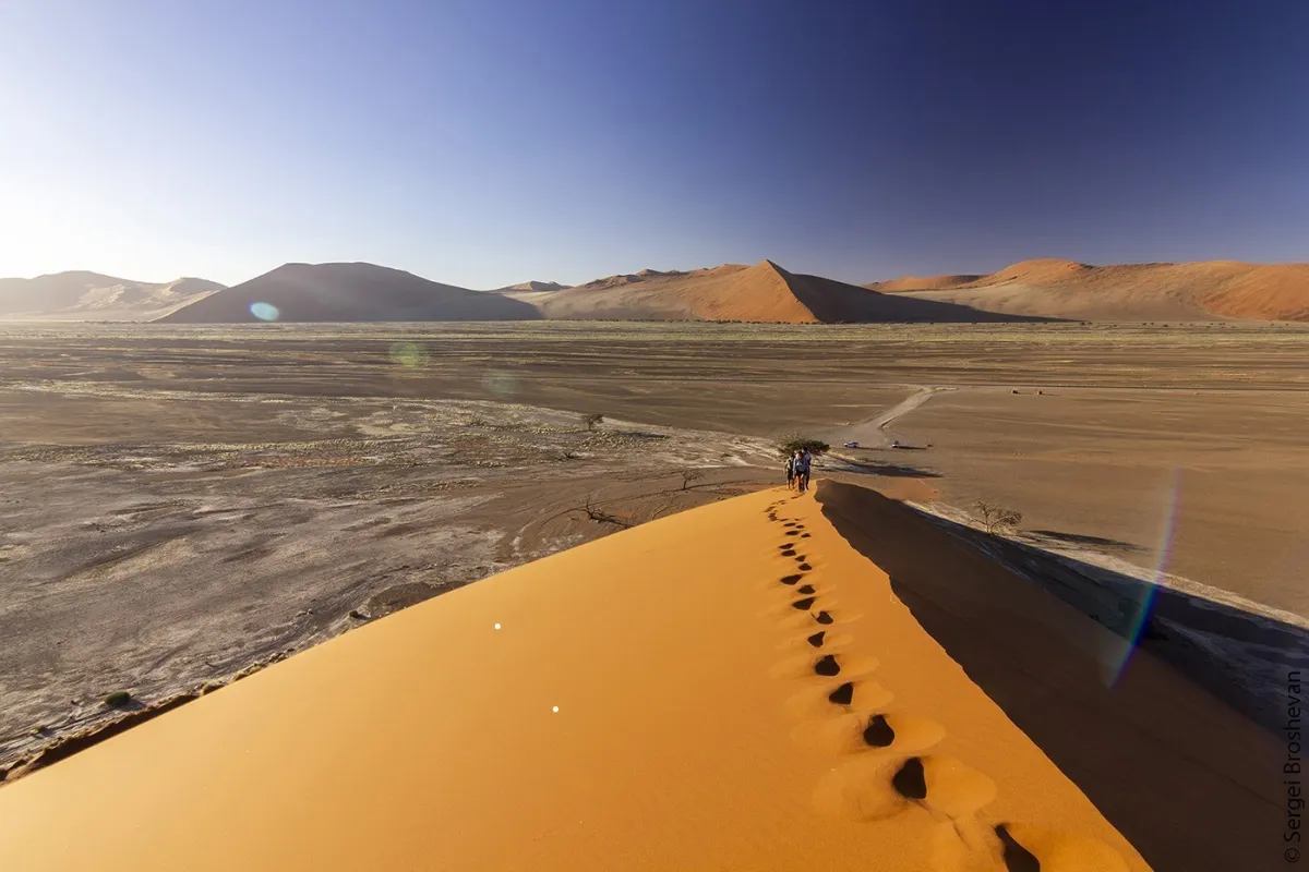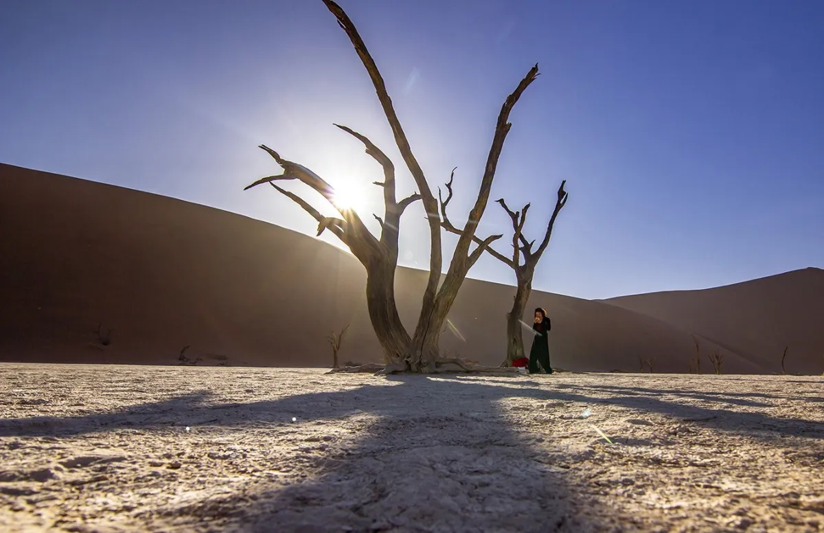 Saulėtekis Deadvlei. Keliamės dar prieš aušrą ir vykstame pasitikti saulės į mirusiųjų slėnį Deadvlei – čia saulėtekio spalvos pačios ryškiausios. Kai tik pakyla saulė ir pirmieji spinduliai apšviečia raudonas kopas, aplink tvyro tyla – neįtikėtinai stiprus jausmas, kurį sunku perteikti žodžiais. Vaikštome ir fotografuojame mirusių medžių slėnį – anksčiau čia tekėjo nedidelė upė, augo medžiai (dažniausiai kupranugarių akacijos), bet laikui bėgant upę užtvėrė kopa, vanduo dingo, ir medžiai išdžiūvo. Dėl sauso dykumos klimato jie nesunyko, o taip ir stovi suakmenėję jau apie 800 metų. Įspūdinga vieta. Grįžtame į stovyklavietę, susirenkame daiktus ir vykstame atgal į Vindhuką. 450 km. Nakvynė viešbutyje.