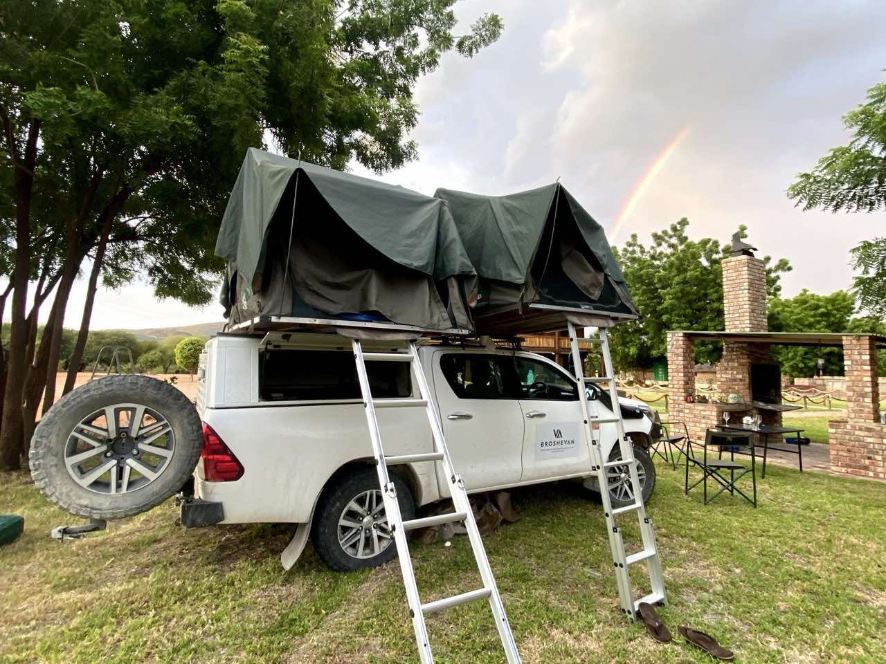 Vindhuko oro uoste mus pasitinka ir nuveža į viešbutį. Oro uoste išsikeičiame pinigus (geriausias kursas visoje Namibijoje) ir nusiperkame SIM kortelę su internetu (15 USD visam laikui). 40 minučių kelio, ir mes įsikuriame viešbutyje. Pasiimame automobilius su visa įranga – dvi palapinės ant stogo, šaldytuvas, stalai, virtuvės reikmenys. Apsiperkame maisto, pailsime. Vakare einame į restoraną (neįskaičiuota) atšvęsti pirmos dienos Afrikoje.